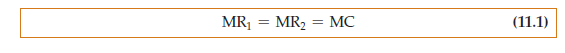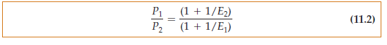 Thus MR1 = P1(1 + 1/E1) and MR2 = P2(1 + 1/E2), where E1 and E2 are the elasticities of demand for the firm’s sales in the first and second markets, respectively. Now equating MR1 and MR2 as in equation (11.1) gives the following relationship that must hold for the prices: