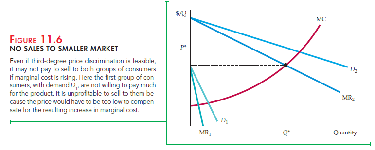 It may not always be worthwhile for the firm to try to sell to more than one group of consumers. In particular, if demand is small for the second group and marginal cost is rising steeply, the increased cost of producing and selling to this group may outweigh the increase in revenue. In Figure 11.6, the firm is better off charging a single price P* and selling only to the larger group of consumers: The additional cost of serving the smaller market would outweigh the additional revenue that might come from selling to it.