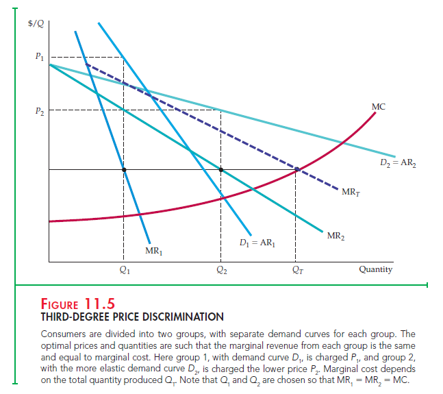 Figure 11.5 illustrates third-degree price discrimination. Note that the demand curve D1 for the first group of consumers is less elastic than the curve for the second group; thus the price charged to the first group is higher. The total quantity produced, Qt = Q1 + Q2, is found by summing the marginal revenue curves MR1 and MR, horizontally, which yields the dashed curve MR, and finding its intersection with the marginal cost curve. Because MC must equal MR1 and MR, we can draw a horizontal line leftward from this intersection to find the quantities Q1 and Q2.