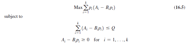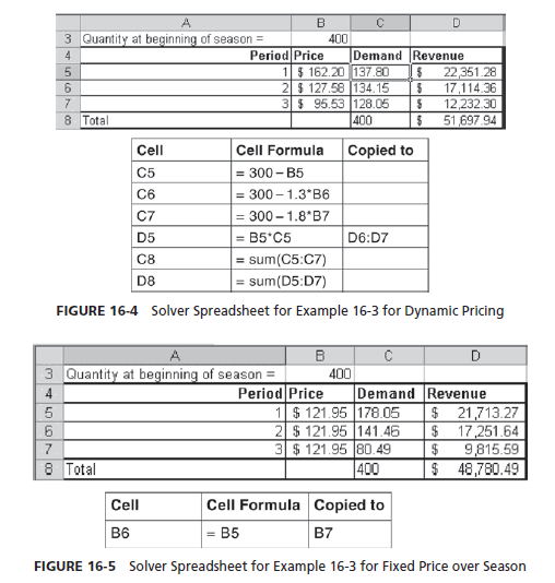 As formulated, the dynamic pricing problem is simple enough that it can be solved directly using Excel as illustrated in Example 16-3 [see worksheets Example16-3(dynamic price) and Example16-3(fixed price)].