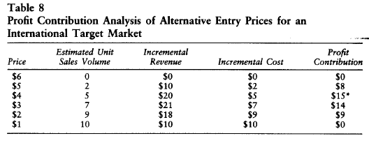 Here the manager has established a range of alternative prices for the candidate product that extends downward from a $6 price, which he esti-mates the target market would fully reject, to a floor price, which equals unit incremental costs of $1. Among these alternative prices, which price would maximize profit (or minimize loss)? The answer is, the price that offers the highest profit contribution, namely, $4 with a profit contribution of $15 (indicated by an asterisk in the table).