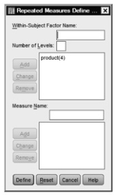 - Delete the factor 1 from the Within-Subject Factor Name box and replace it with the name product, our name for the repeated-measures independent variable that SPSS will generate from the four products.