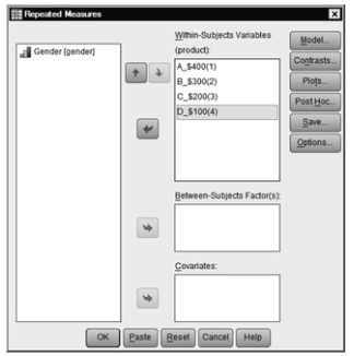 - Now move A_$400, B_$300, C_$200, D_$100 over to the Within-Subjects Variables