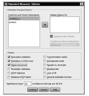 - Click on Contrasts. Be sure Polynomial is in the parenthesis after product (see 10.5). SPSS does not provide post hoc tests for the within- subjects (repeated-measures) effects, so we will use contrasts. If the products are ordered, let’s say, by price, we can use the polynomial contrasts that are interpreted below. If we wanted to use a different type of contrast, we could change the type by clicking on the arrow under Change Contrast.