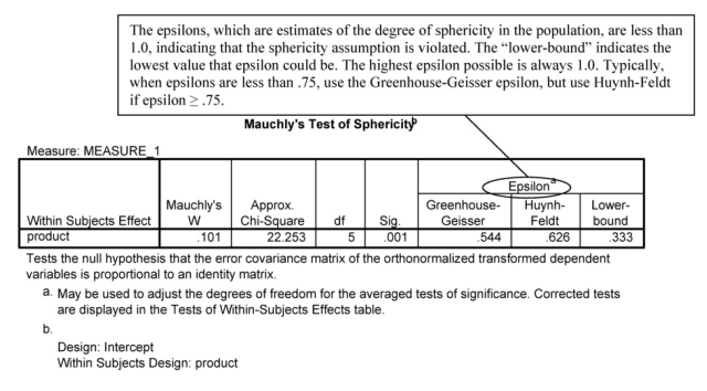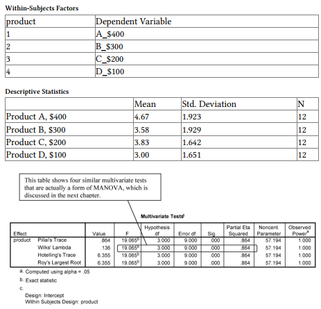 The third table presents four similar Multivariate Tests of the within- subjects effect (i.e., whether the four products are all rated equally). Wilks’ lambda is a commonly used multivariate test. Notice that in this case, the Fs, df, and significance are the same for each of the multivariate tests: F(3, 9) = 19.07, p < .001. The significant F means that there is a difference somewhere in how the products are rated. The multivariate tests can be used even if sphericity is violated. However, if epsilons are high, indicating that one is close to achieving sphericity, these multivariate tests may be less powerful in the next table (less likely to indicate statistical significance) than the corrected univariate repeated-measures ANOVA shown below. Also note that the observed power is extremely high (1.0); thus it would be possible to have a statistically significant result with a small effect size, which might not be practically meaningful. However, partial eta is very large (7.864 = .93) so this is not an issue.