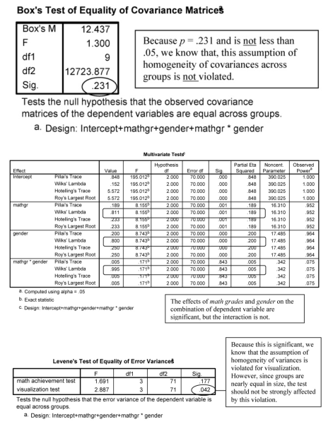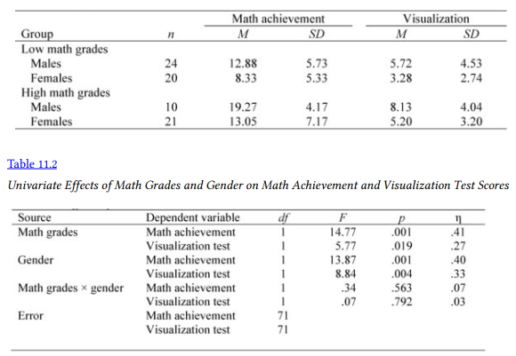 To assess whether boys and girls with higher and lower math grades have different math achievement and visualization test scores and whether there was an interaction between gender and math grades, a multivariate analysis of variance was conducted. (The assumptions of independence of observations and homogeneity of variance/covariance were checked and met. Bivariate scatterplots were checked for multivariate normality.) The interaction was not statistically significant, Wilks’ A = .995, F(2, 70) = .17, p =.843, multivariate n2 = -005- The main effect for gender was statistically significant, Wilks’ A = .800, F(2, 70) = 8.74, p < .001, multivariate n2 = -20- This indicates that the linear composite of math achievement and visualization test differs for males and females. The main effect for math grades is also statistically significant, Wilks’ A = .811, F(2, 70) = 8.15, p = .001, multivariate n2 = .19. This indicates that the linear composite differs for different levels of math grades. Follow-up ANOVAs (Table 11.2) indicate that effects of both math grades and gender were statistically significant for both math achievement and visualization. Males scored higher on both outcomes and students with higher math grades were higher on both outcomes (see Table 11.1).