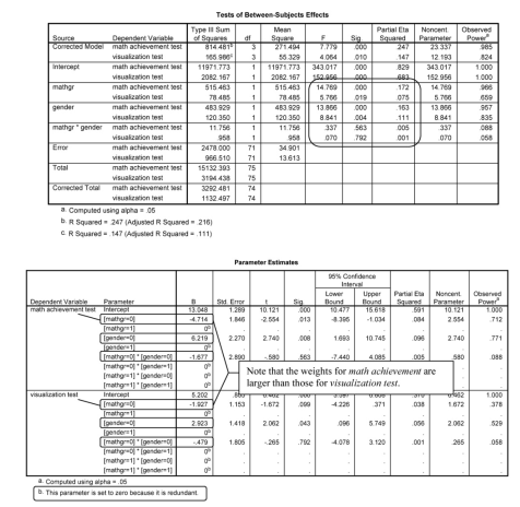 - Do students who differ in math grades and gender differ on a linear combination of two dependent variables (math achievement and visualization test)? Do males and females differ in terms of whether those with higher and lower math grades differ on these two variables (is there an interaction between math grades and gender)? What linear combination of the two dependent variables distinguishes these groups?