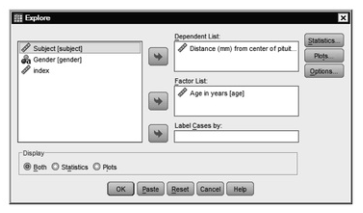 - First, compute descriptive statistics by clicking on Analyze → Descriptive Statistics → Explore.
