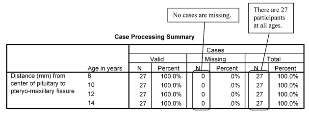 The first table in Output 12.1a shows us that there were 27 children at each age, so there was no attrition over time, and none were missing data on distance at any age. The Descriptives table shows that at age 8, the average distance (mm from the center of the pituitary to the pteryomaxillary fissure) was 22.19 (SD = 2.43); at 10, 12, and 14, the mean distances were 23.17, 24.65, and 26.09, respectively, with corresponding standard deviations of 2.16, 2.82, and 2.77. These numbers, along with the boxplots, suggest that distance increases in a linear manner; however, to see if there is one change in direction/rate of change (and to show you how to do polynomial trends), we will also look at a quadratic trend for age.