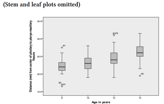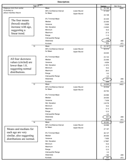 First, we examine the output from the Explore program, which provides us with descriptive statistics for the distance variable at each age period. We have omitted the stem-and-leaf plots to conserve space because we can obtain the most pertinent information from the tables and boxplot.