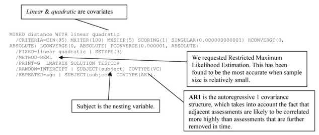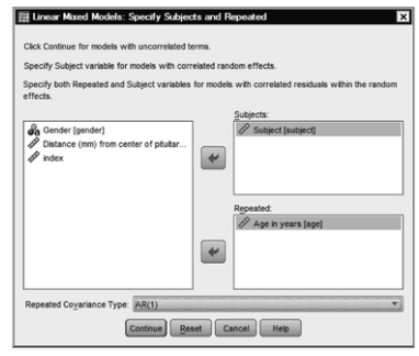 - Click on the arrow next to Repeated covariance type, and change Diagonal to specify AR(1), as shown in 12.2. This is an autoregressive covariance structure with homogeneous variances, with a lag of 1 (one age level in this case). The autoregressive structure indicates that each person’s distance measurement at one time is correlated with his or her distance measurement at the previous time period, which is typical of a repeated-measures situation.