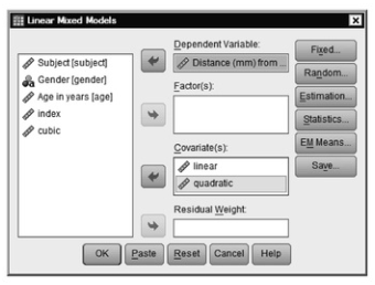 - Click on Quadratic and move it into the Covariate(s): box. We have created these two variables to look at the linear and quadratic effects of age, referenced to the youngest age. Note that these really get at the effects of age, even though they are separate variables, because they correspond to the different levels of Age in the dataset. Both consist of weights beginning with 0, which causes SPSS to use the initial age level as the reference. The quadratic weights simply involve squaring the linear weights. So, linear weights are 0, 1, 2, 3 and quadratic are 0,1,4,9 (see Growth study.sav, linear and quadradic “variables”. We are not doing a cubic effect, so we will not use the cubic variable).