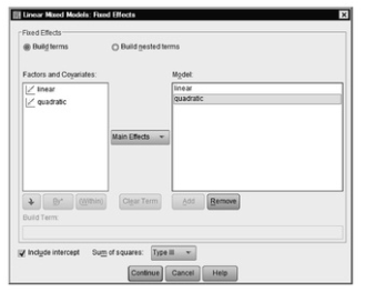 - Click on linear and then on Add; this will move linear into the Model Repeat this for quadratic. Leave the defaults for the other options, making sure that Include intercept is checked and Type III sums of squares is in the box for sums of squares (see Fig. 12.4).