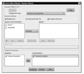 - We have already included an autoregressive, repeated measures structure for the Age variable, and have entered fixed effects for the polynomial trend analysis, so we will not add any independent variables to the Random Effects.
