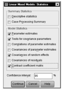 - Click on Statistics. Select Parameter estimates, Test for covariance parameters, Covariances of random effects, and Contrast coefficient matrix (see 12.6).