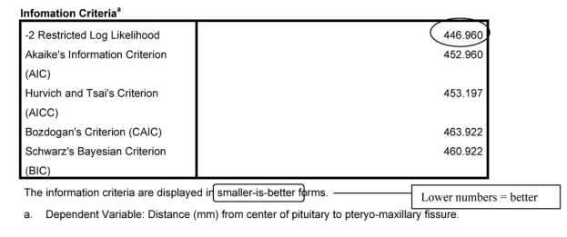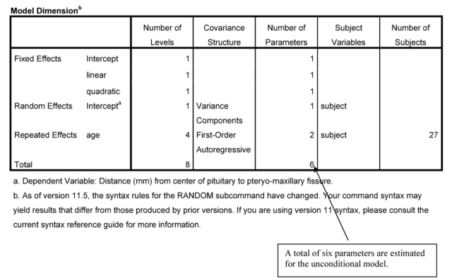 First, you see the log file, or syntax, indicating what you did. Note that you used REML (Restricted Maximum Likelihood) as your estimation method (the default method in SPSS, so we didn’t need to specify it). REML adjusts for the fixed effects, usually leading to a reduction in standard error. It has been found to be more accurate than Full Maximum Likelihood when there is a small number of entities (in this case, participants).