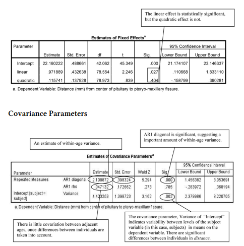 Interpretation of Output 12.1 continued In the Fixed Effects table, we see the intercept for the Distance variable (Intercept) and linear and quadratic effects of age. The t test for the intercept is testing whether the average Distance from the pituitary to the pteryomaxillary fissure, across individuals, is statistically significantly different from zero, which it is, t(42.06) = 45.35, p < .001; however, this is not really of interest. The t test for linear and quadratic are more familiar and more useful, testing whether the Distance variable changes statistically significantly in a linear and/or quadratic fashion across the four ages (8, 10, 12, and 14 years). We see that the linear growth curve is significant, t(78.55) = 2.25, p = .027. On the other hand, the quadratic growth curve is not significant, t(78.97) = .84, p =.40. We are omitting the Type III Estimable functions table from the output reproduced here to save space, but these show you how the computer program contrasted the dummy variables.