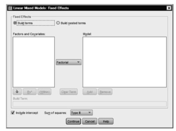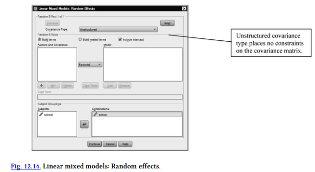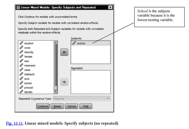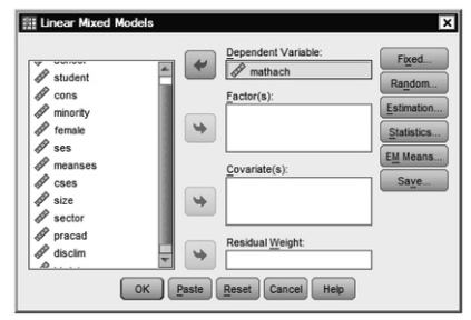 - Highlight mathach and move it into the Dependent Variable: box. Do not put in any factors or covariates for this unconditional model. Your window should look like Fig. 12.12.