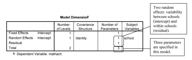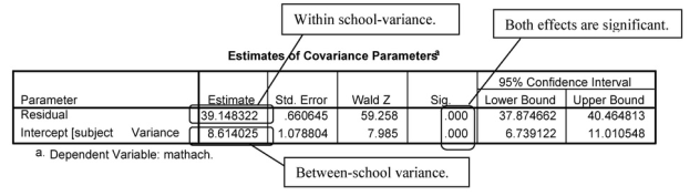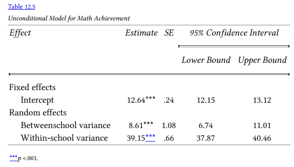 This output is very similar to Output 12.1b, in that it is an unconditional model. This time, there is no repeated-measures variable. Instead, participants are nested in particular schools, which may have their own specific characteristics. The Model dimension table shows that there are 3 parameters. One is the estimate for the fixed intercept effect, which, as before, is not of conceptual interest. The other two are for the random school effect (variability between schools) and residual (variability within schools). The Fixed Effects and Covariance Parameters tables show that all three of these effects are statistically significant (p < .001), showing that the mean is statistically significantly different from zero, and there is significant variability to explain both within schools and between schools. The main purpose of this unconditional model is to see if there is a significant amount of variability in math achievement within schools (the covariance parameter labeled Residual) and variability between schools (the covariance parameter labeled Intercept [subject = Variance school]), and there is. Note that this is the estimate of the variability among the means of the schools.