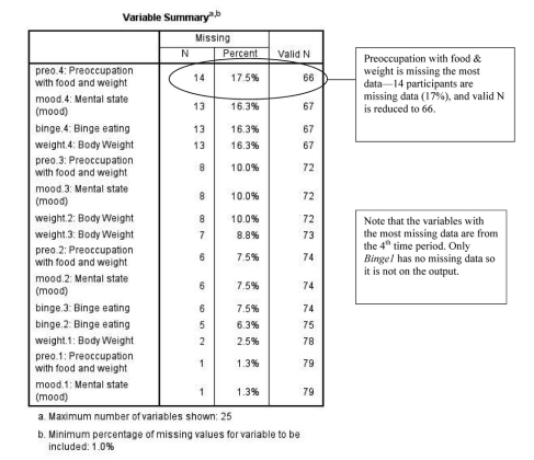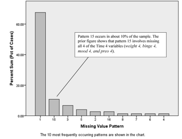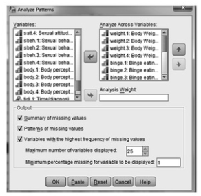 - Select weight 1 through weight 4 and move them over to analyze across variables. Do the same with binge 1-4, mood 1-4, and preo1-4. Make sure that Summary of missing values, Patterns of missing values, and Variables with the highest frequency of missing values are all checked. Change the Minimum percentage missing from 10 to 1. See 13.1.