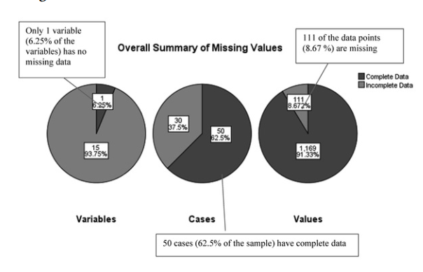 Interpretation of Output 13.1 (continued) The Variable Summary table specifies the number of missing cases, percent missing, and valid N for each variable that is missing at least 1% of the data. We can see that from 1-14 participants (1-17.5% of the sample) are missing data on these variables. Given the sample size, this is sufficient missing data to warrant imputation, as it would decrease power and accuracy of results with these variables, especially with those variables with 10% or more missing.