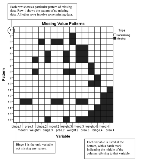 Interpretation of Output 13.1 (continued) The Missing Value Patterns figure is the most important one. It shows 16 different patterns of missing values that exist in the data, in terms of which data are missing. The pattern types are numbered on the left side. So, for example, pattern 2 involves missing only the variable weight 2; pattern 16 involves missing binge 3, weight 3, mood 3, preo 3, weight 4, binge 4, mood 4, and preo 4. So, pattern 16 seems systematic, but not related specifically to one particular variable; rather, it seems to include participants who stopped participating after the second timepoint.