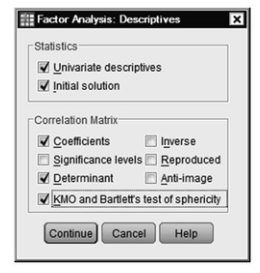 - Then click on the following: Initial solution and Univariate Descriptives (under Statistics), Coefficients, Determinant, and KMO and Bartlett’s test of sphericity (under Correlation Matrix).