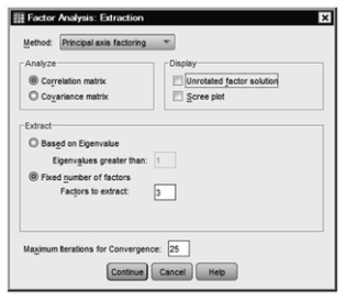- Click on Fixed number of factors under Extract, and type 3 in the box. This setting instructs the computer to extract three math attitude factors.