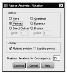 - Click on Varimax, then make sure Rotated solution is also checked. Varimax rotation creates a solution in which the factors are orthogonal (uncorrelated with one another), which can make results easier to interpret and to replicate with future samples. If you believe that the factors (latent concepts) are correlated, you could choose Direct Oblimin, which will provide an oblique solution allowing the factors to be correlated.