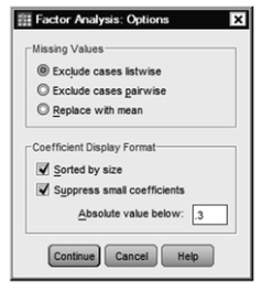 - Click on Suppress small coefficients and type .3 (point 3) in the Absolute Value below box (see 4.5). Suppressing small factor loadings makes the output easier to read.