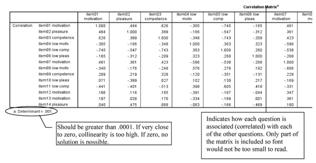 One assumption is that the determinant (located under the correlation matrix) should be more than .0001. Here, it is .001 so this assumption is met. If the determinant is zero, then a factor analytic solution cannot be obtained, because this would require dividing by zero, which would mean that at least one of the items can be understood as a linear combination of
