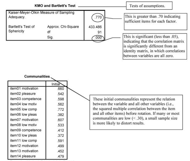 Interpretation of Output 4.1 continued The second table is part of a correlation matrix showing how each of the 14 items is associated with each of the other 13. Note that some of the correlations are high (e.g., + or -.60 or greater) and some are low (i.e., near zero). Relatively high correlations indicate that two items are associated and will probably be grouped together by the factor analysis. Items with low correlations (e.g., <.20) usually will not have high loadings on the same factor.