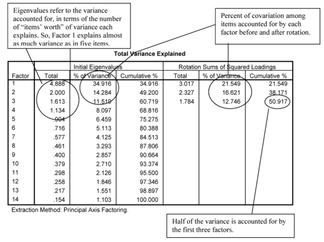 Interpretation of Output 4.1 continued The Total Variance Explained table shows how the variance is divided among the 14 possible factors. Note that four factors have eigenvalues (a measure of explained variance) greater than 1.0, which is a common criterion for a factor to be useful. When the eigenvalue is less than 1.0 the factor explains less information than a single item would have explained. Most researchers would not consider the information gained from such a factor to be sufficient to justify keeping that factor. Thus, if you had not specified otherwise, the computer would have looked for the best four-factor solution by “rotating” four factors. Because we specified that we wanted only three factors rotated, only three will be rotated, as seen on the