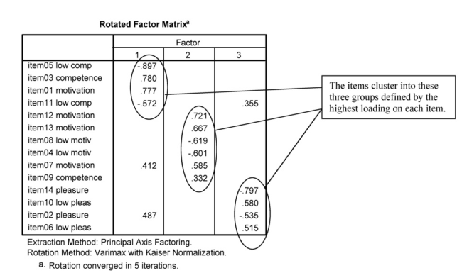 Note that the analysis has sorted the 14 math attitude questions (item01 to item14) into three somewhat overlapping groups of items, as shown by the circled items. The items are sorted so that the items that have the highest loading (not considering whether the correlation is positive or negative) from factor 1 (four items in this analysis) are listed first, and they are sorted from the one with the highest factor weight or loading (i.e., item05, with a loading of -.897) to the one with the lowest loading from that first factor (item11). Actually, every item has some loading from every factor, but we requested for loadings less than |.30| to be excluded from the output, so there are blanks where low loadings exist. (|.30| means the absolute value, or value without considering the sign.) Next, the six items that have their highest loading from factor 2 are listed from highest loading (item12) to lowest (item9). Finally, the four items on which factor 3 loads most highly are listed in order. Loadings resulting from an orthogonal rotation are correlation coefficients between each item and the factor, so they range from -1.0 through 0 to + 1.0. A negative loading just means that the question needs to be interpreted in the opposite direction from the way it is written for that factor (e.g., item05 “I am a little slow catching on to new topics in math” has a negative loading from the competence factor, which indicates that the people scoring higher on this item are lower in competence). Usually, factor loadings lower than |.30| are considered low, which is why we suppressed loadings less than |.30|. On the other hand, loadings of |.40| or greater are typically considered high. This is just a guideline, however, and one could set the criterion for “high” loadings as low as .30 or as high as .50. Setting the criterion lower than .30 or higher than .50 would be very unusual.