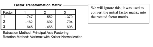 The Rotated Factor Matrix table is key for understanding the results of the analysis. Factors are rotated so that they are easier to interpret. Rotation makes it so that, as much as possible, different items are explained or predicted by different underlying factors, and each factor explains more than one item. This is a condition called simple structure. Although this is the goal of rotation, in reality, this is not always achieved. One thing to look for in the Rotated Matrix of factor loadings is the extent to which simple structure is achieved.