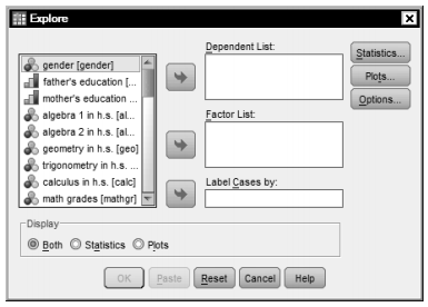 - Click on Both under This will produce both a table of descriptive statistics and two kinds of plots: stem-and-leaf and box-and-whiskers.