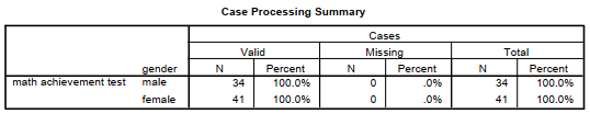 The first table under Explore provides descriptive statistics about the number of males and females with Valid and Missing data. Note that we have 34 males and 41 females with valid math achievement test scores.