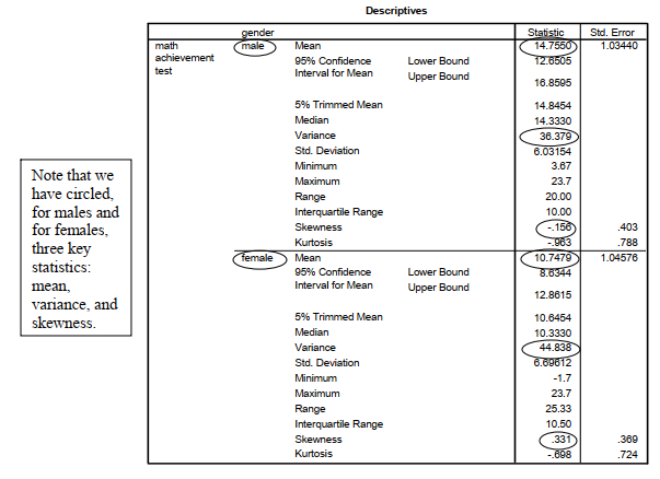 Outputs 4.2a and 4.2b, you can tell if a variable is grossly non-normal by looking at the boxplots. The stem-and-leaf plots provide similar information. You can also examine the skewness values for each gender separately in the table of Descriptives (see the circled skewness values). Note that for both males and females, the skewness values are less than one, which indicates that math achievement is approximately normal for both genders. This is an assumption of the t test.