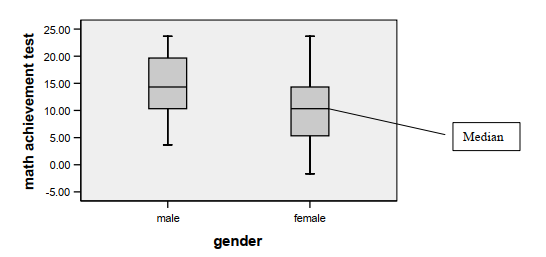 The Stem-and-Leaf Plots for each gender separately are next. These plots are like a histogram or frequency distribution turned on the side. They give a visual impression of the distribution, and they show each person’s score on the dependent variable (math achievement). Note that the legend indicates that Stem width equals 10 and Each leaf equals one case. This means that entries that have 0 for the stem are less than 10, those with 1 as the stem range from 10 to 19, and so forth. Each number in the Leaf column represents the last digit of one person’s math achievement score. The numbers in the Frequency column indicate how many participants had scores in the range represented by that stem and range of leaves. Thus, in the male plot, one student had a Stem of 0 and a Leaf of 3, that is, a score of 03 (or 3). The Frequency of students with leaves between 05 and 09 is 7, and there were three scores of 5, two of 7, and two of 9. One had a Stem of 1 and a Leaf of 0 (a score of 10); two had scores of 11, and so forth.