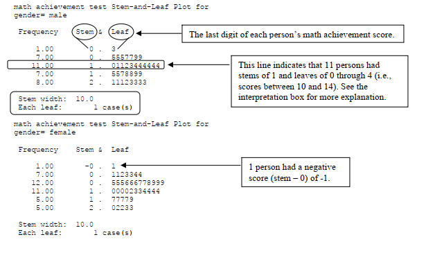 The Stem-and-Leaf Plots for each gender separately are next. These plots are like a histogram or frequency distribution turned on the side. They give a visual impression of the distribution, and they show each person’s score on the dependent variable (math achievement). Note that the legend indicates that Stem width equals 10 and Each leaf equals one case. This means that entries that have 0 for the stem are less than 10, those with 1 as the stem range from 10 to 19, and so forth. Each number in the Leaf column represents the last digit of one person’s math achievement score. The numbers in the Frequency column indicate how many participants had scores in the range represented by that stem and range of leaves. Thus, in the male plot, one student had a Stem of 0 and a Leaf of 3, that is, a score of 03 (or 3). The Frequency of students with leaves between 05 and 09 is 7, and there were three scores of 5, two of 7, and two of 9. One had a Stem of 1 and a Leaf of 0 (a score of 10); two had scores of 11, and so forth.