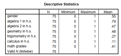 DESCRIPTIVES VARIABLES=gender alg1 alg2 geo trig calc mathgr /STATISTICS= MEAN MIN MAX .