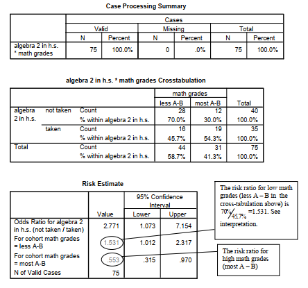 Because whether or not students took algebra 2 and whether their math grades were high or low were both binary variables and neither alternative was rare, an odds ratio was computed. The OR was 2.77, indicating that the odds of students getting low math grades if they didn’t take algebra 2 were 2.77 times as high as the odds for those who did take algebra 2.