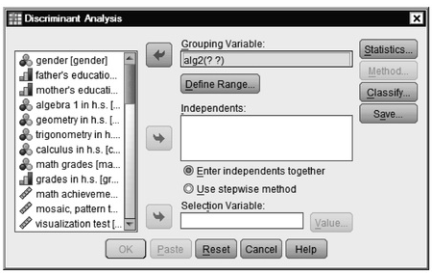 Discriminant analysis is appropriate when you want to predict which group participants will be in (in this example, who took algebra 2). The procedure produces a discriminant function (or for more than two groups, a set of discriminant functions) based on linear combinations of the predictor variables that provide the best overall discrimination among the groups. The grouping or dependent variable can have more than two values, but this will increase the complexity of the output and interpretation. The codes for the grouping variable must be integers. You need to specify their minimum and maximum values, as we will in Fig. 8.3. Cases with values outside these bounds are excluded from the analysis.