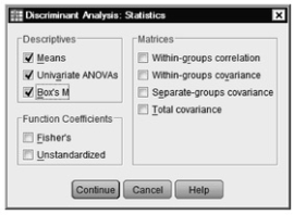 - Select Means, Univariate ANOVAs, and Box’s M (see 8.5). Click on Continue.