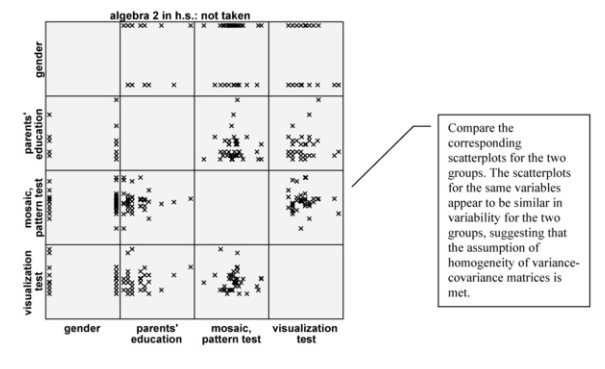 Next, to check the assumption of homogeneity of variance-covariance matrices across groups we created scatterplots (below) after splitting the data by the grouping variable (in this case algebra 2 in h.s.). To split the file into groups, follow these steps to use Split File.