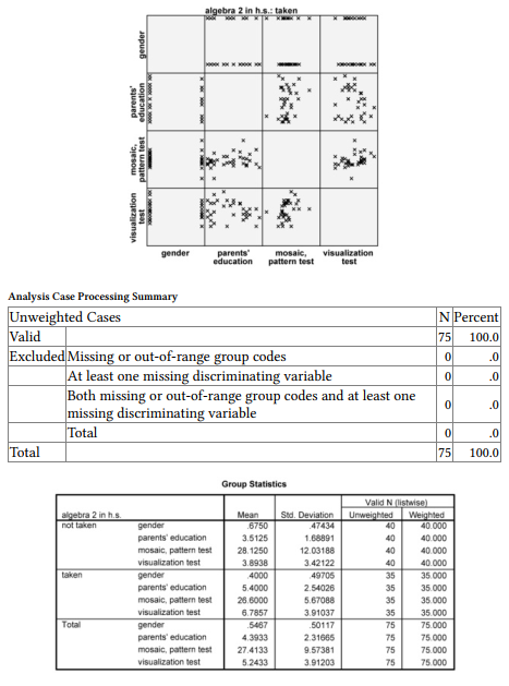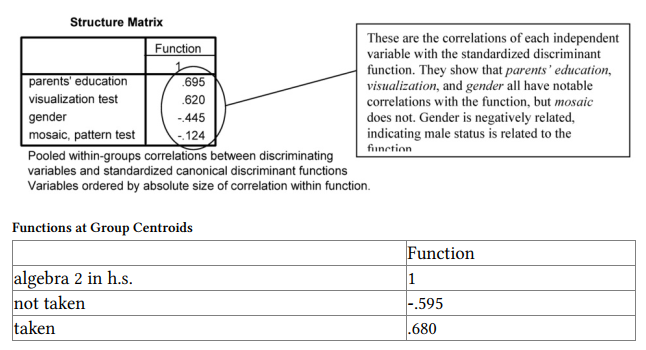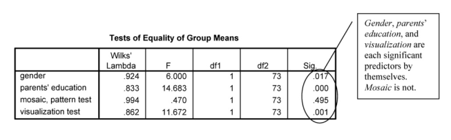 The Group Statistics table provides basic descriptive statistics for each of the independent/predictor variables for each outcome group (did not take algebra 2 and did take it) separately and for the whole sample. The Tests of Equality of Group Means table shows which independent variables are significant predictors by themselves; it shows the variables with which there is a statistically significant difference between those who took algebra 2 and those who did not. As was the case when we used logistic regression, gender, parents’ education, and visualization test are statistically significant.