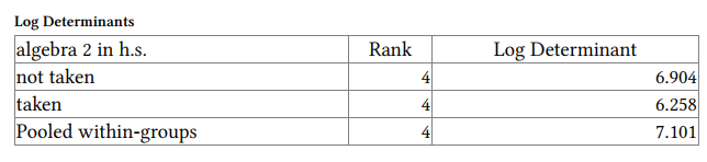 The ranks and natural logarithms of determinants printed are those of the group covariance matrices.