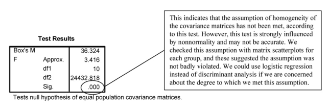 Discriminant analysis (DA) is similar to multivariate analysis of variance (MANOVA, discussed in Chapter 11), except that the independent and dependent variables are switched; thus, the conceptual basis for the study is typically different. In DA, one is trying to devise one or more predictive equations to maximally discriminate people in one group from those in another group; in MANOVA, one is trying to determine whether group members differ significantly on a set of several measures. Therefore, the assumptions for DA are similar to those for MANOVA.