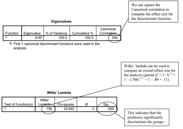 Wilks’ lambda can be used to compute an overall effect size for the analysis (partial r]2 = 1-A13 = 1 -(.706)1/3 = 1 – .89 = .11).