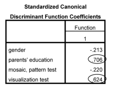 This table indicates how heavily each variable is weighted in order to maximize discrimination of groups. In this example, parents’ education and visual are weighted more than gender and mosaic.